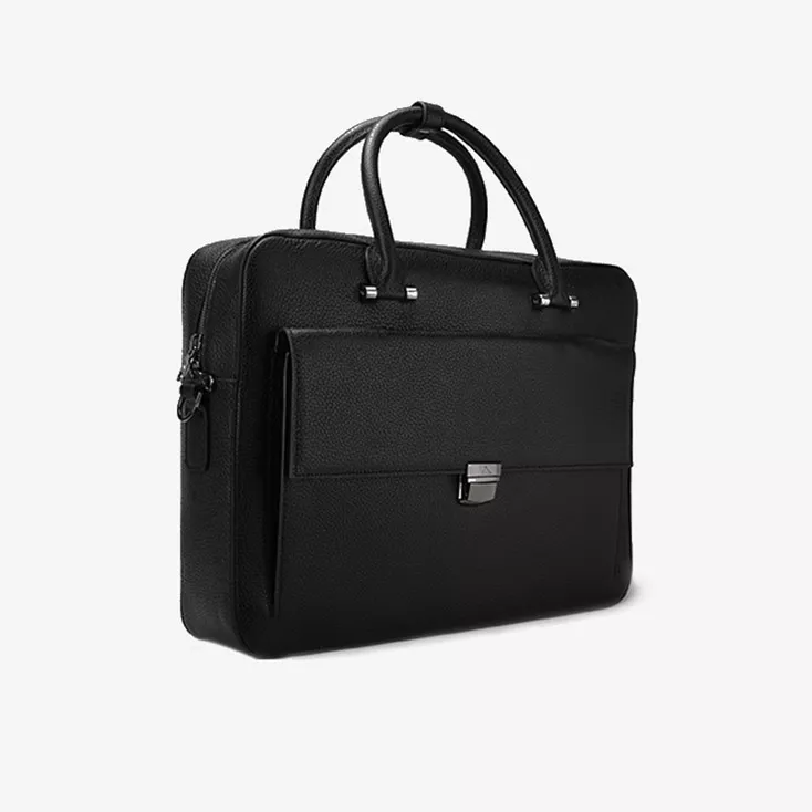 طراحی کاربردی این محصول با یک جیب بزرگ در قسمت جلویی تکمیل شده است که با یک قفل فلزی شیک و محکم بسته می‌شود؛ فضایی ایده‌آل برای مدارک دم‌دستی، تبلت یا دفترچه یادداشت که نیاز به دسترسی سریع دارند. دسته‌های محکم و ارگونومیک کیف با اتصالات فلزی براق به بدنه متصل شده‌اند که تحمل وزن لپ‌تاپ و پرونده‌های سنگین را تضمین می‌کنند. حلقه‌های فلزی کناری نیز امکان اتصال بند دوشی را برای حمل راحت‌تر فراهم می‌کنند.